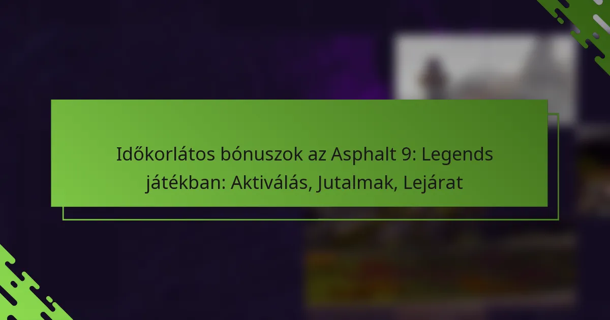 Az időkorlátos bónuszok az Asphalt 9: Legends-ben különleges jutalmak, amelyeket a játékosok egy meghatározott időkereten belül szerezhetnek meg. Ezek a bónuszok a játékmenet fokozására és a játékosok aktívabb részvételének ösztönzésére lettek tervezve.